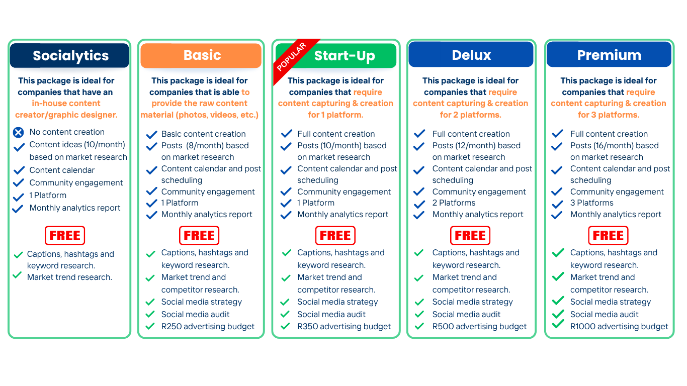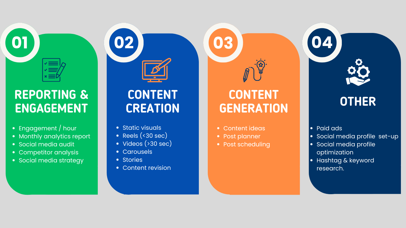 Each package has been strategically crafted to deliver more than just posts; we offer content that aligns with your goals, all backed by a solid strategy, consistency, and measurable results. Our structured packages provide maximum value and flexibility, and we’re happy to customize any package further to meet your brand’s specific goals and industry demands.